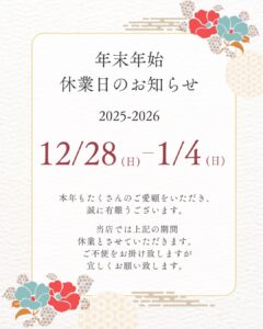 誠に勝手ながら12/28(日)〜1/4(日)まで休業日となります。